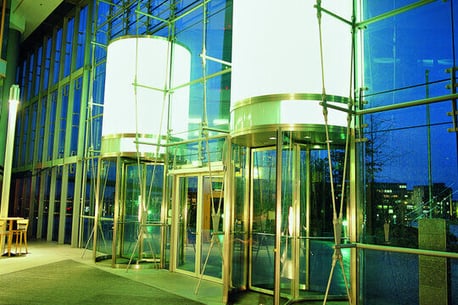 Der Eingang wurde von uns mit zwei dreiflügeligen Karusselltüren versehen, die sich stilsicher in die luftige, aus Stahlstreben und Glas gehaltene Fassade einbetten. Die Karusselltüren fungieren gleichzeitig als Träger von überdimensionierten Hauben, die besonders nachts mit ihrem sanften Leuchten einen auffälligen Blickfang bilden.